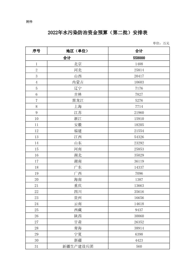 6月17日,財政部發(fā)布關(guān)于下達(dá)2022年度水污染防治資金預(yù)算(第二批)的通知,合計55.8億元,詳情如下: