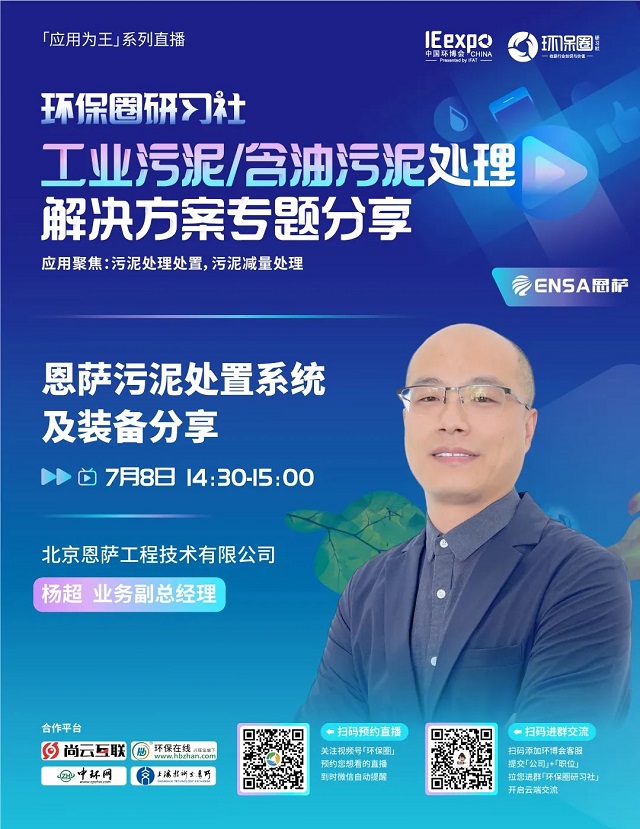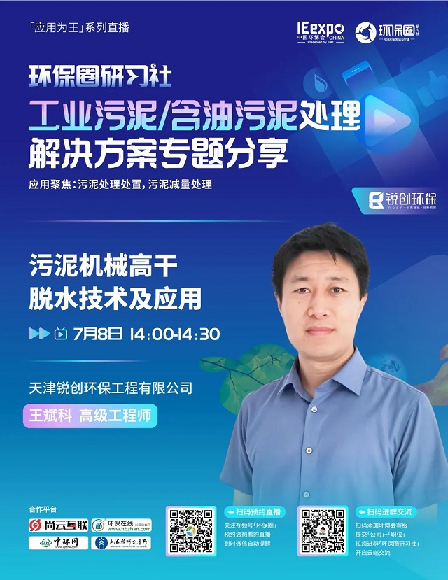 7月8日(星期五)下午14:00-15:30,環保圈研習社“應用為王”系列直播工業污泥/含油污泥處理解決方案專題分享,有幸邀請到了銳創環保、北京恩薩、江蘇康泰環保3家企業的技術專家做客直播間,聚焦工業污泥/含油污泥處理,為大家分享污泥處理處置,污泥減量處理解決方案。