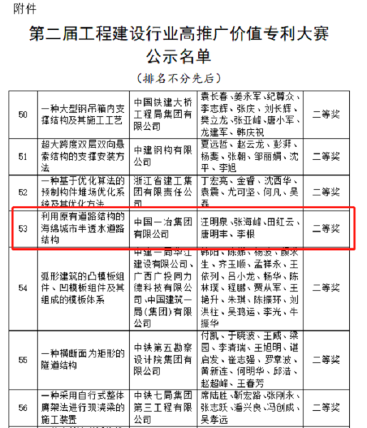 近日,在中國(guó)施工企業(yè)管理協(xié)會(huì)舉辦的第二屆工程建設(shè)行業(yè)高推廣價(jià)值專(zhuān)利大賽上,中國(guó)一冶城建公司推薦的《利用原有道路結(jié)構(gòu)的海綿城市半透水道路結(jié)構(gòu)》專(zhuān)利技術(shù)榮獲二等獎(jiǎng)。