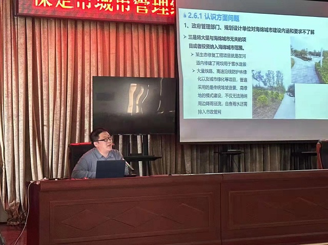 接著,馬洪濤教授針對規(guī)劃是基礎(chǔ),構(gòu)建全面科學的海綿城市規(guī)劃體系;方案是指引,編制合理系統(tǒng)的海綿城市實施方案;項目是根本,做好科學合理的海綿城市設(shè)計方案;機制是基礎(chǔ),構(gòu)建完整可行的海綿城市推進機制;模式是保障,選擇綜合統(tǒng)籌的海綿城市建設(shè)模式;交流是助力,形成通俗易懂的海綿城市語言體系等方面,結(jié)合其他城市建設(shè)經(jīng)驗,針對保定實際,做了深入淺出、通俗易懂的細致講解。