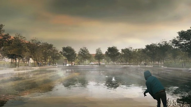 這座公園坐落在山腳下,它的改造基于增設蓄水空間的想法。混凝土曲棍球場被降低了3m,變成了蓄洪空間。當球場蓄滿水后,雨水會流向下沉式的玫瑰花園,最終匯入湖中。公園中還計劃建造可調蓄雨洪的洼地。拉夫恩還提到,公園圍墻的建造能夠有效防止雨水外流,同時通過巧妙的設計,也可避免場地中的古樹移植。