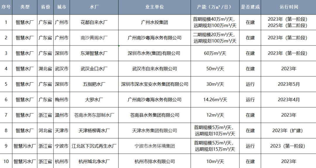 水務(wù)加對2023年上半年國內(nèi)新建或升級改造的智慧水廠、智慧污水廠進行了盤點,其中智慧水廠共8家,智慧污水廠共2家,詳情如下 (按產(chǎn)能進行排序):