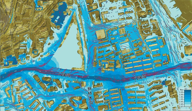 以受災較嚴重的門頭溝和中門寺溝兩個流域為例,8月1日雨勢減小后,工作組即刻到山洪沖擊地區進行現場調研,收集實地洪水排泄及淹沒資料;8月4日開始搭建洪水反演模擬模型,經過近20次的驗證調試,模擬結果基本符合實際。經過驗證的模型,可以模擬不同降雨條件下洪水和城市內澇的淹沒情況,為災后恢復重建、長遠高質量發展提供決策支持。