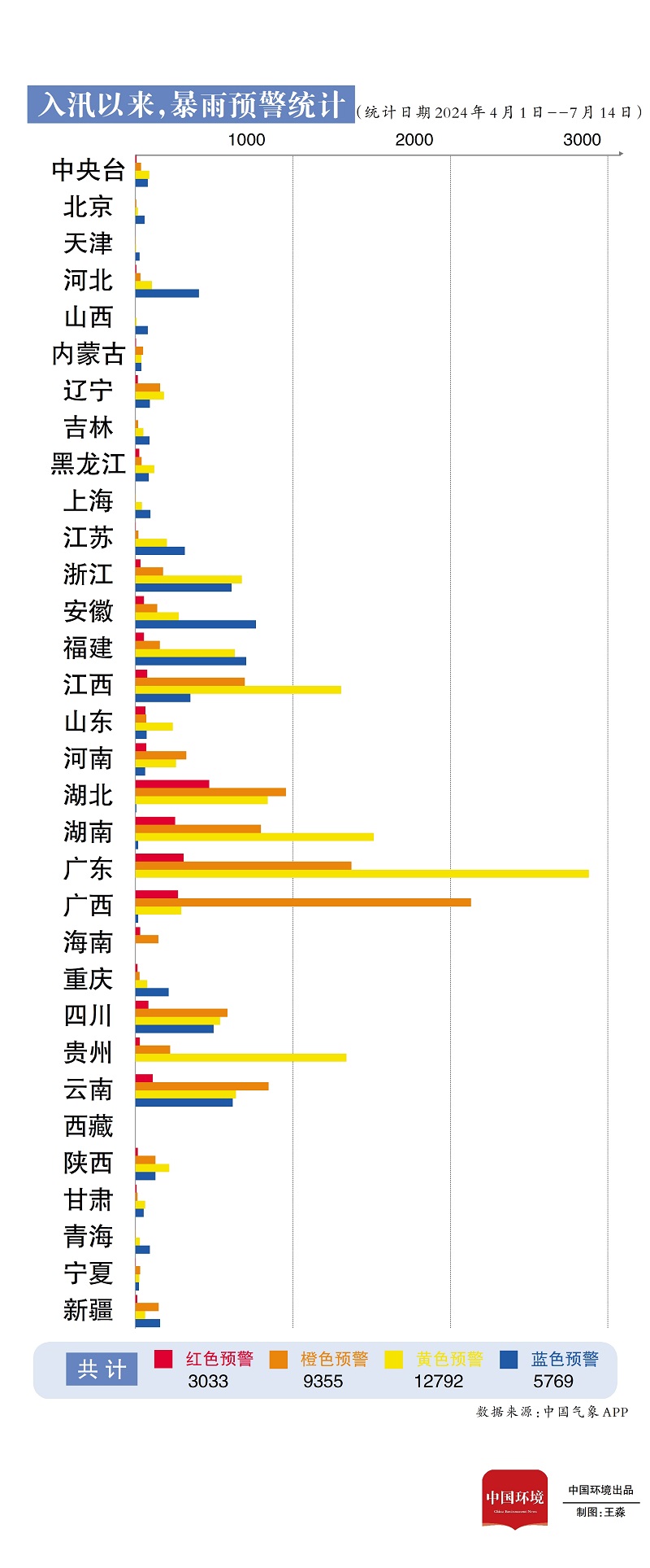 僅在6月份,南方地區經歷了多輪強降雨天氣過程,中央氣象臺從6月10日開始連續21天發布暴雨預警,其中4天發布了最高級別的暴雨紅色預警。全國共發布紅色預警信息1969條,其中暴雨紅色預警信息占全部的45.7%,同比增加61.1%。