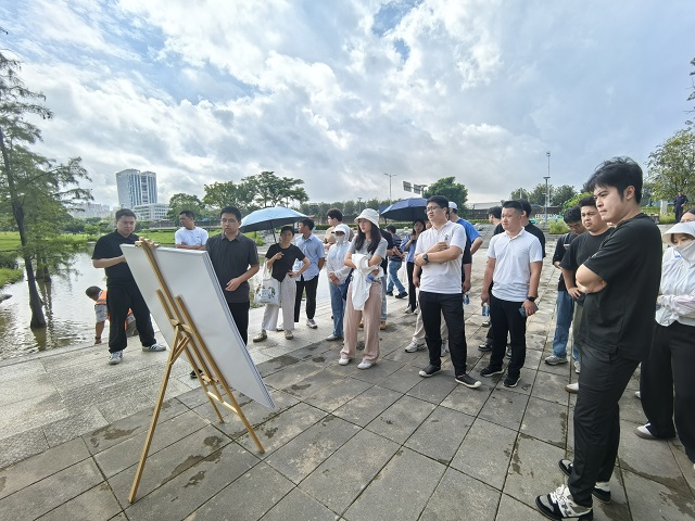 第一階段活動為現場調研。參加活動的人員現場觀摩了光明區典范海綿城市建設項目——樓村濕地公園。區海綿辦工作人員介紹了光明區海綿城市建設歷程,并結合樓村濕地公園介紹光明區如何從場地豎向、地表組織徑流、雨洪調蓄等方面打造精品海綿城市項目。區節水辦工作人員介紹了近年來光明區節水與再生水工作的舉措和成效,以樓村濕地公園成功創建節水型公園和再生水取水樣板站為案例,介紹公園再生水處理流程、取水方式及再生水用于園區綠化澆灑等情況。區環境水務有限公司工作人員結合水情教育基地,詳細介紹了光明區水務工作各板塊發展進程、近年來取得的成就及面臨的挑戰,并強調節水與水資源保護的重要性。