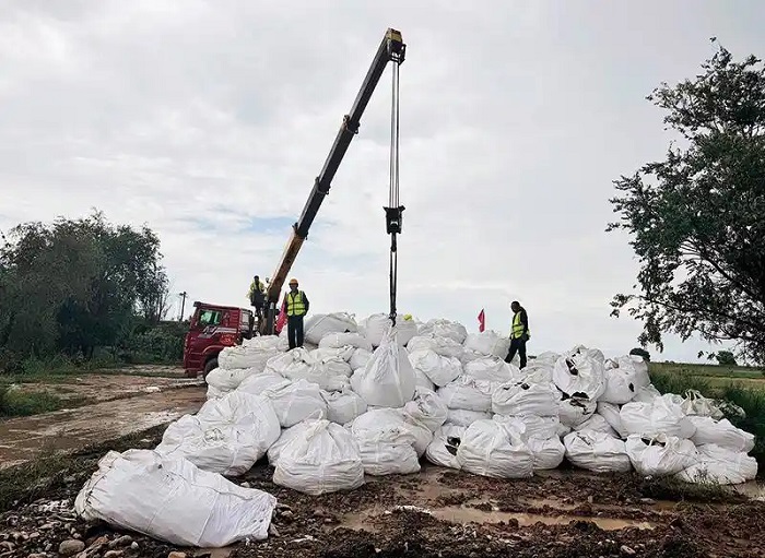 內(nèi)蒙古包頭市土默特右旗的搶險人員加快調(diào)運噸包等防汛物資(2025年8月10日攝)王靖攝