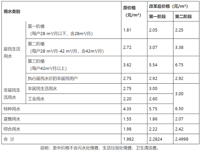 注:調(diào)整后的各類供水價(jià)格,均不包含水資源稅(0.05元/立方米)、污水處理費(fèi)(居民用水0.95元/立方米,非居和特種用水1.4元/立方米)、垃圾處理費(fèi)(居民:7元戶/月)。