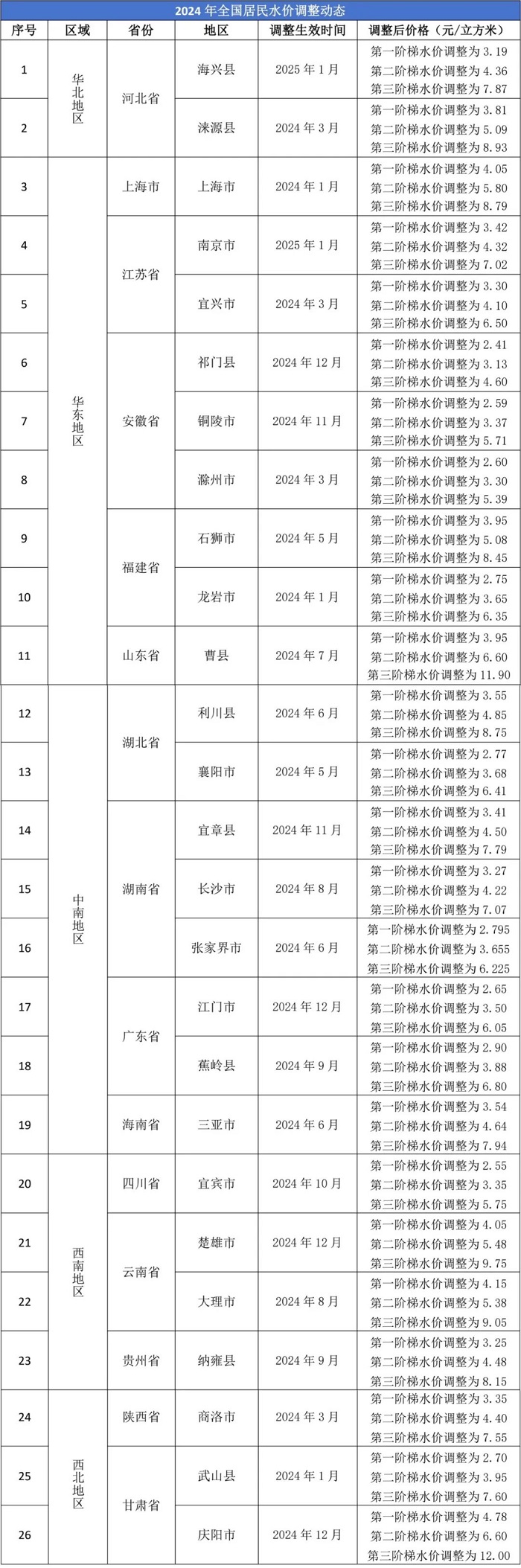 【附】2024年調(diào)整水價(jià)的城市匯總(數(shù)據(jù)來(lái)自“水務(wù)加”微信公眾號(hào)):
