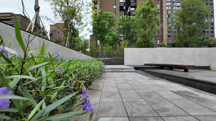 東林道小區(qū)將海綿設(shè)施功能與景觀環(huán)境融合,依托雨水花園打造了充滿自然野趣的景觀小品,雨水花園和透水鋪裝分布在小區(qū)內(nèi),雨水不會(huì)直接從步道流向管渠,而是先進(jìn)入雨水花園或透水鋪裝滯留和滲透,多余的雨水可流入市政管網(wǎng)或調(diào)蓄池,可用于物業(yè)灌溉等。如此一來(lái),既保證了路面干爽潔凈,又讓水資源得到了循環(huán)利用。